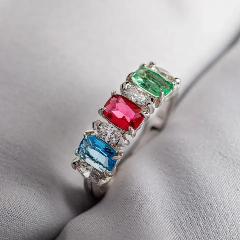 Anel em Ródio Branco com Zircônias Retangulares e Ovaladas em Cristal nas Cores Azul, Rosa e Verde
